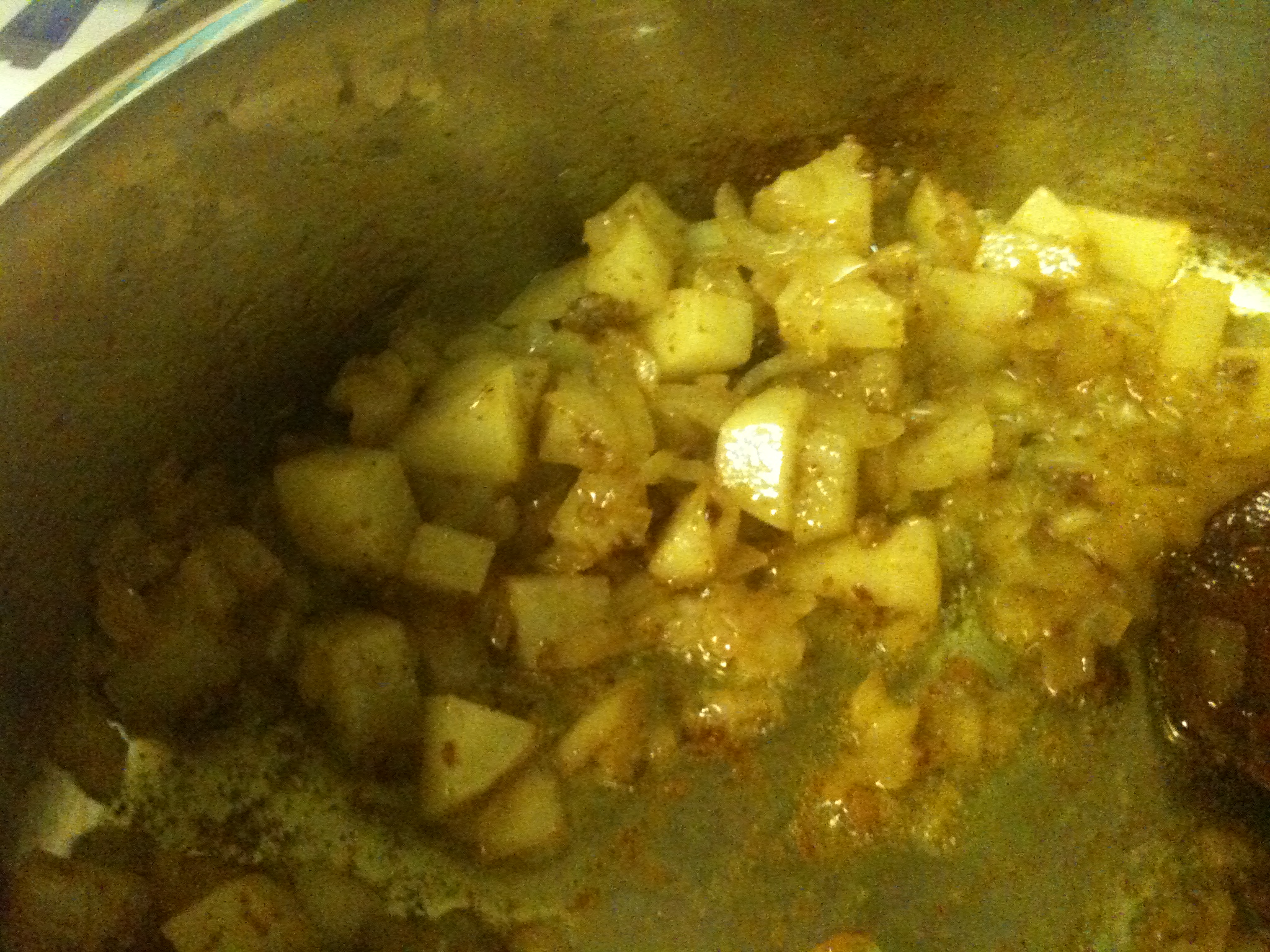 Add curry powder and potatoes and cook, stirring occasionally, until potatoes are translucent, 3 to 5 minutes more. Add water and cook, stirring and scraping up any brown bits from bottom of skillet, until liquid is absorbed and potatoes are tender, about 1 minute.