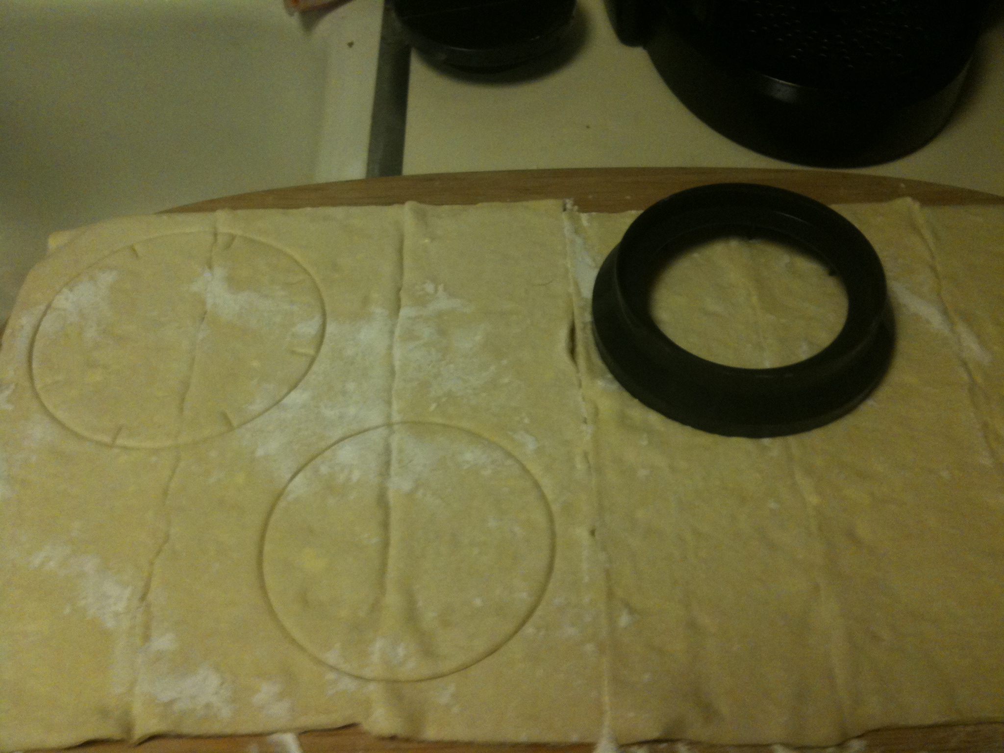 Next we rolled out the puff pastry on a lightly floured surface. Using the handy cutter that comes with the pie maker, we cut 4 pie bases and 4 pie tops.