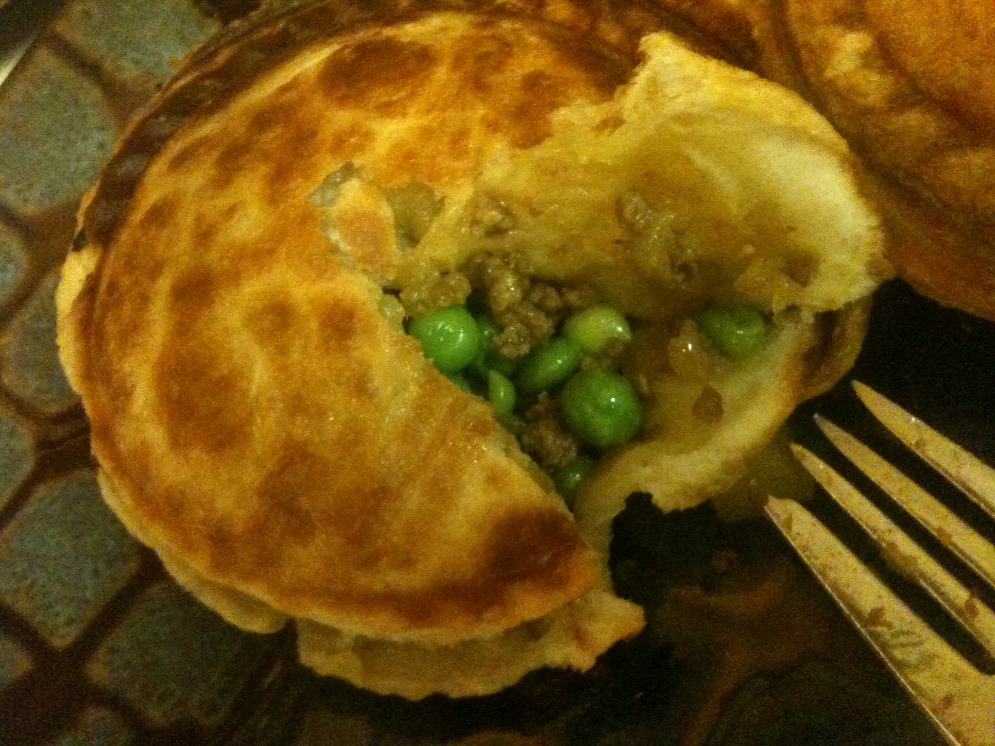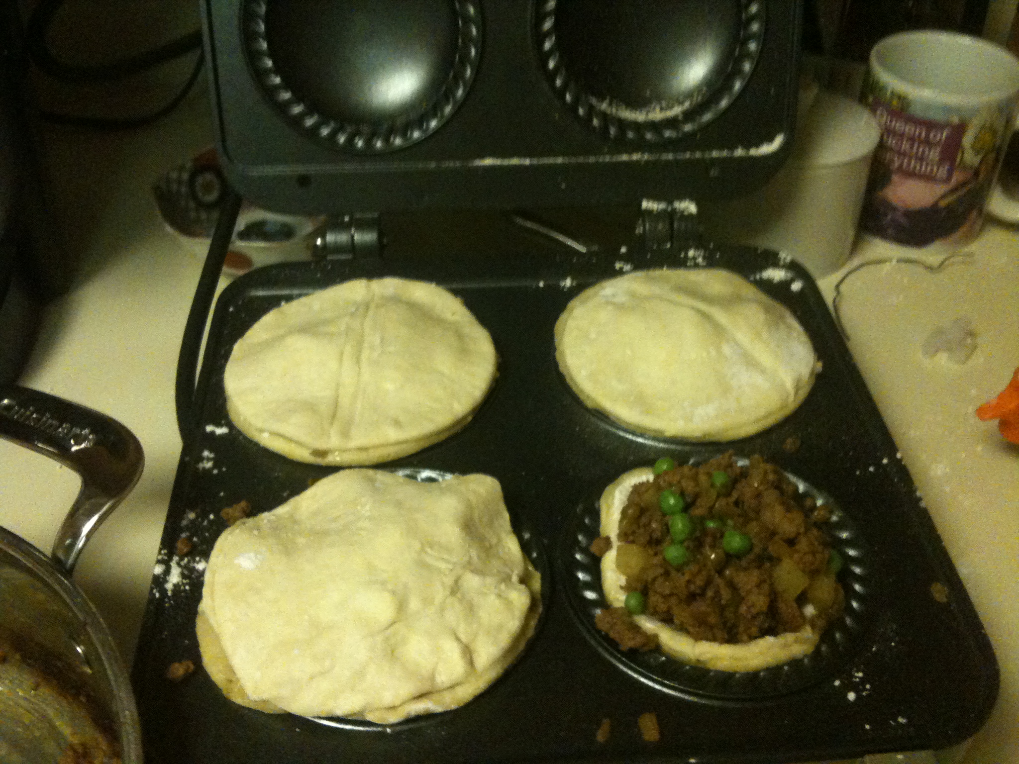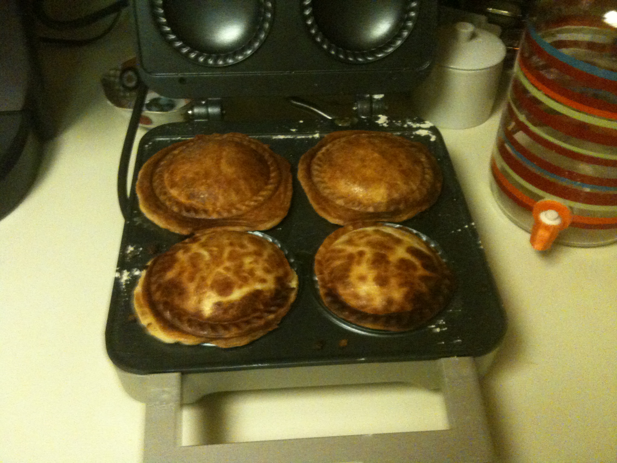 Back on target. The book recommended letting it heat through 2 cycles, although I’m not convinced this was necessary and may actually have made the molds too hot. Then we pressed the bases into the molds and filled them with beef. Then placed the top rounds of puff pastry on top. Closed the lid and waited for pie magic to happen.