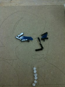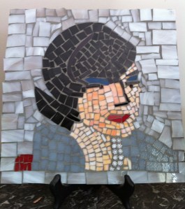 Being as her pearls are one of her most precious possessions, they were one of the first items I made using millefiore. They were also the easiest. Then, piece by piece using peach coloured stained glass, Ms. Surly’s face came into focus.