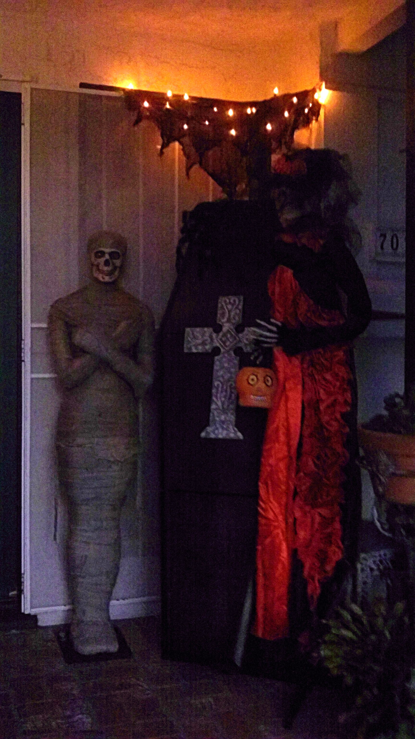 At Chez Surly we’re purists about Halloween. We decorate the front yard with skeletons, a mummy in a coffin, and other traditional elements to make small children cower in terror and cry. I make sure to dress like the mean lady down the street that will cook you in her cauldron if you wander into her yard, and I suggest the parents x-ray the candy we just gave their sweet child. We prefer to scar the neighbourhood children for life socially, not sexually. They have high school for that.